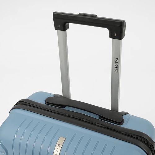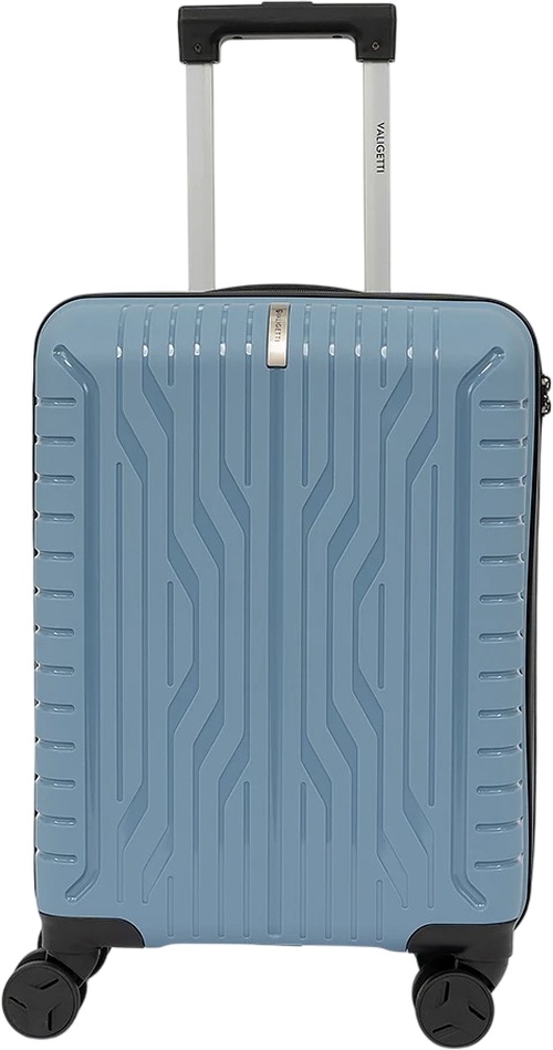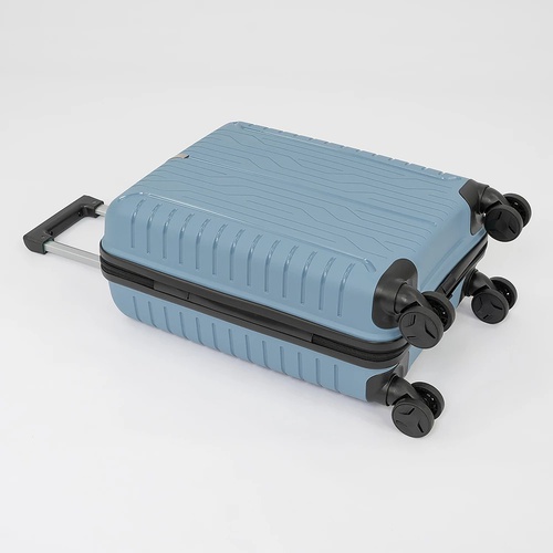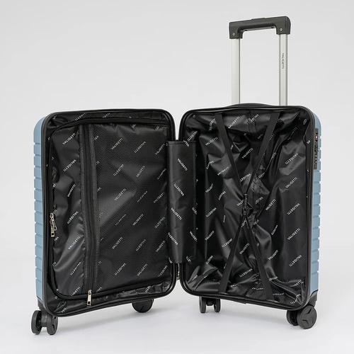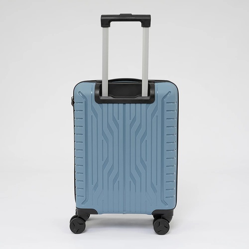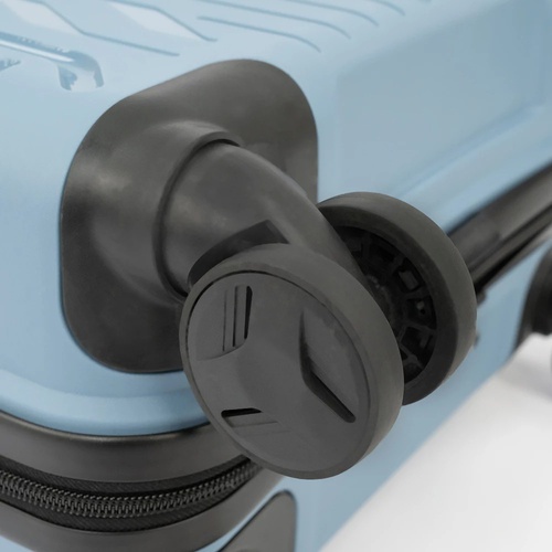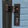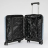 Маневренный чемодан-спиннер из ударопрочного термостойкого полипропилена с рельефной поверхностью синего цвета.