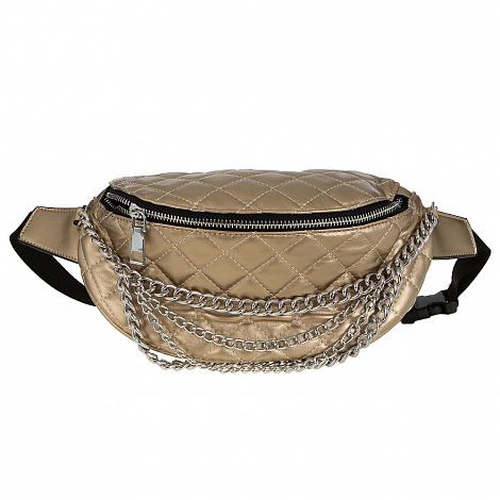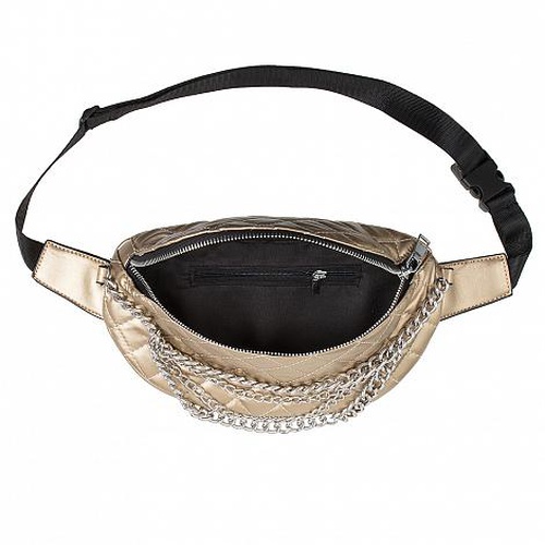 Женская поясная сумка от бренда Passo Avanti золотого цвета выполнена из искусственной кожи и декорирована цепочкой. Фиксируется текстильным ремнем с застежкой фастекс. Основное отделение с текстильной подкладкой на молнии.